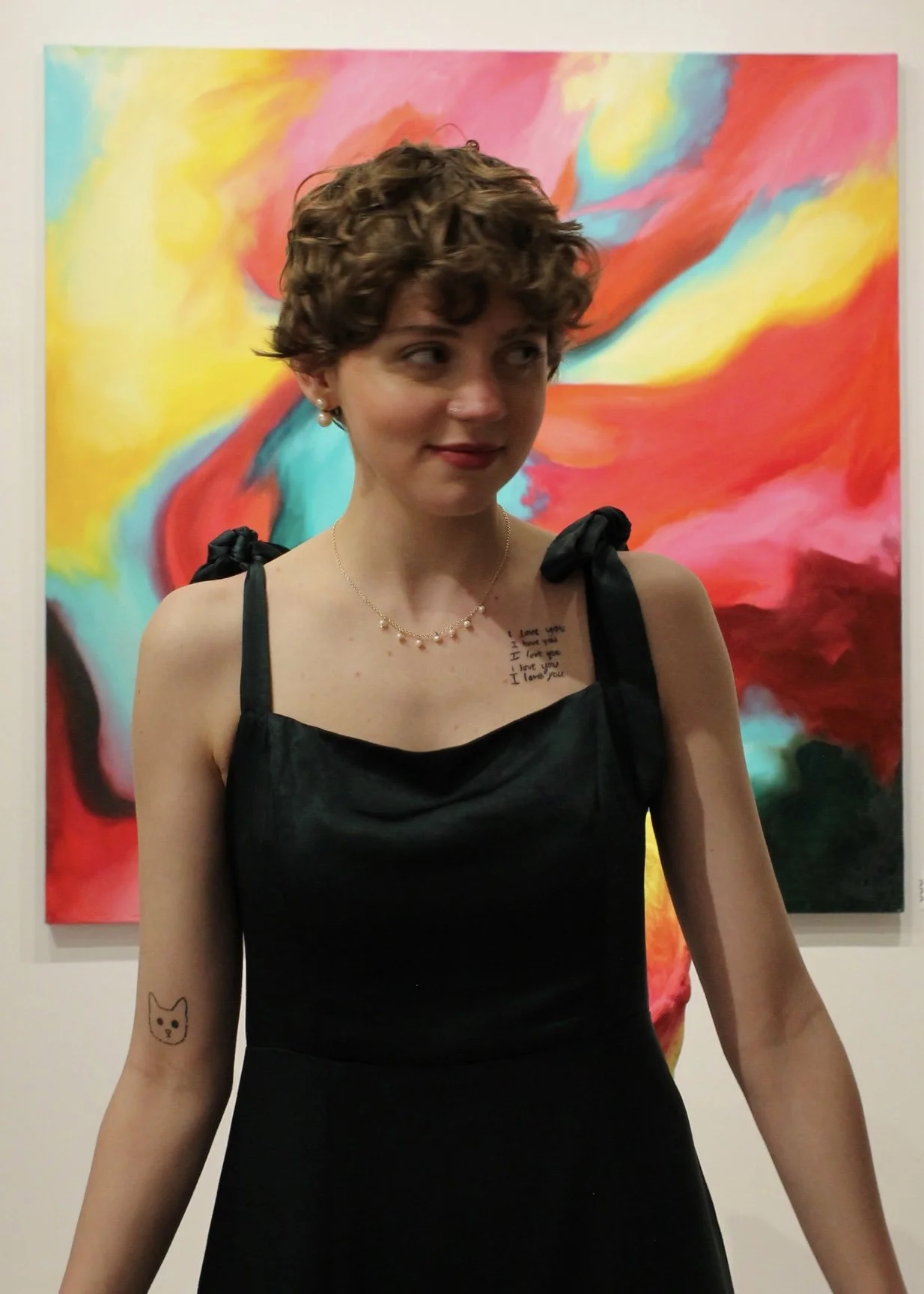 Bijou is a painter who works mainly in acrylic and oil. She loves exploring identity and memory through vivid color and reimagined portraits. Bijou often exaggerates features or adds fantasy-like elements to her artworks, yes she also practices realistic portrait painting of both people and animals. Bijou’s art is fueled by weird color combinations, characters from video games and books, and from her own memories and experiences. Originally born in California, Bijou moved to Ohio as a child and will soon be an alum of The Ohio State University, where she’s developed both technical and artistic skills. Her artwork is about transformation, seeing ordinary subjects through a lens of possibility, imagination, and emotion.